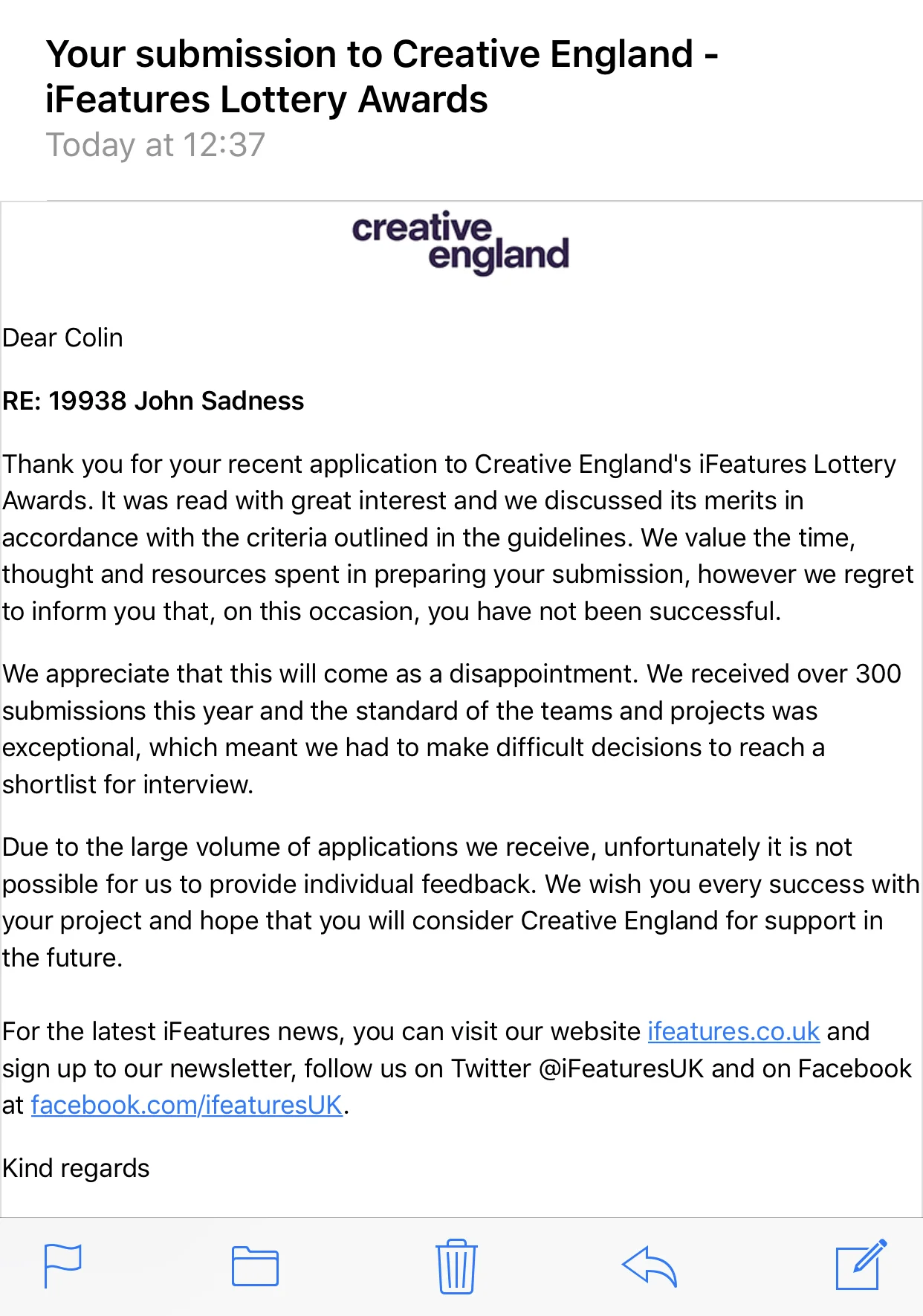 If you’re waking up to an iFeatures rejection, don’t be deterred. Believe in the idea? Keep sending it out. Got another script? Keep writing. Remember, you’re not doing your job right if you’re not getting rejections. The key thing is to keep going.